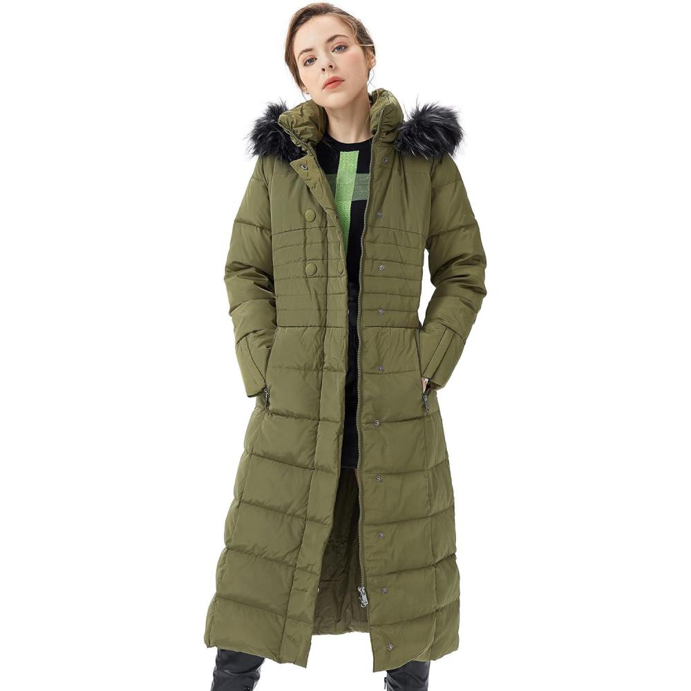 Orolay Women Warm Down Jacket with Hood Fur Long Puffer Coat(Armygreen)